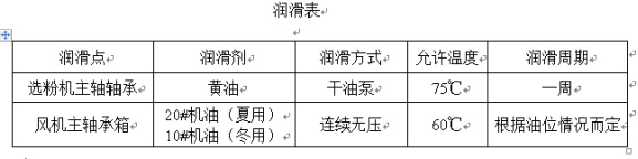 在日常運(yùn)行中,應(yīng)保證各潤滑點(diǎn)充分潤滑,并定期對粉分離器內(nèi)軸承和風(fēng)機(jī)軸承進(jìn)行潤滑(見下表)。在日常維護(hù)中,注意粉體分離器轉(zhuǎn)子的平衡。如發(fā)現(xiàn)異常振動,應(yīng)立即停機(jī)檢查原因,并可在運(yùn)行前繼續(xù)故障。